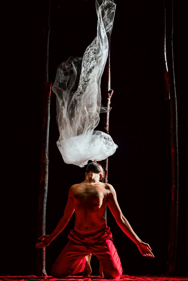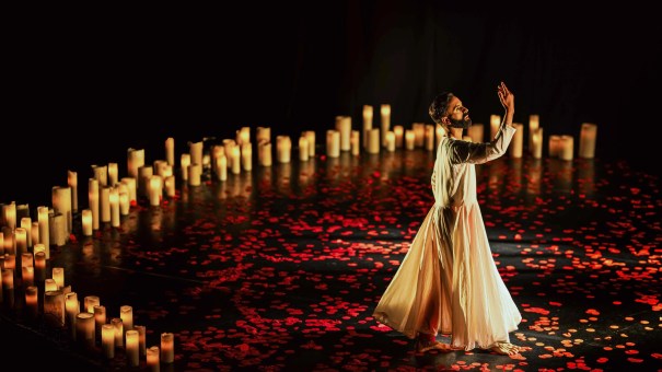 Rose petals drift and swirl as he glides, leaps, and spins, tracing the bulbul’s longing. In the final moments, candles flicker and gauze drifts onto the stage. Odedra lifts and sweeps the fabric, flowing with the light. Through the interplay of gauze, glow, and petals, the soul seems to rise; weightless, luminous, meeting the Divine.